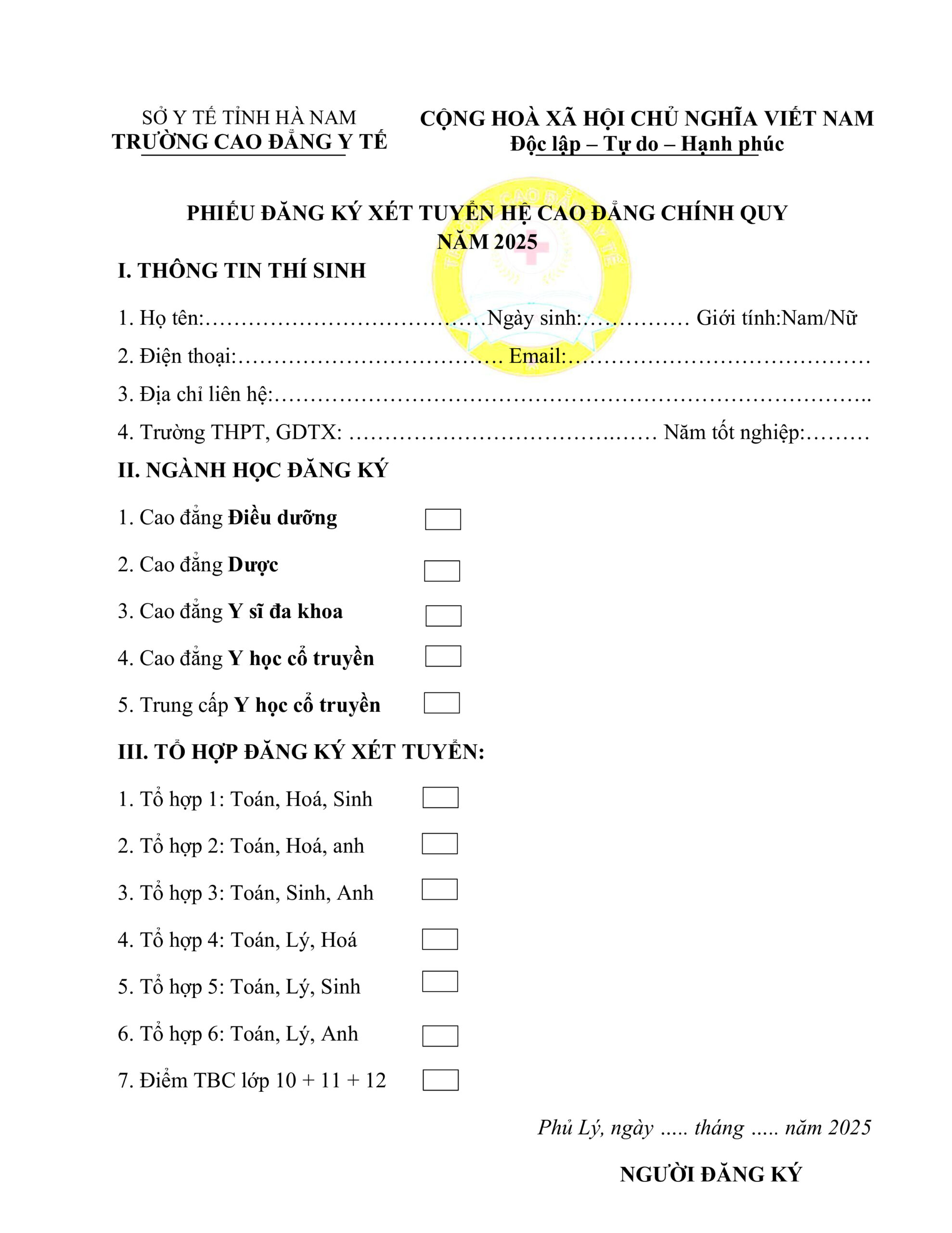 Thí sinh đăng kí xét tuyển các mã ngành của trường Cao đẳng Y tế Hà Nam, điền thông tin theo mẫu phiếu đăng kí xét tuyển 2025 của trường.