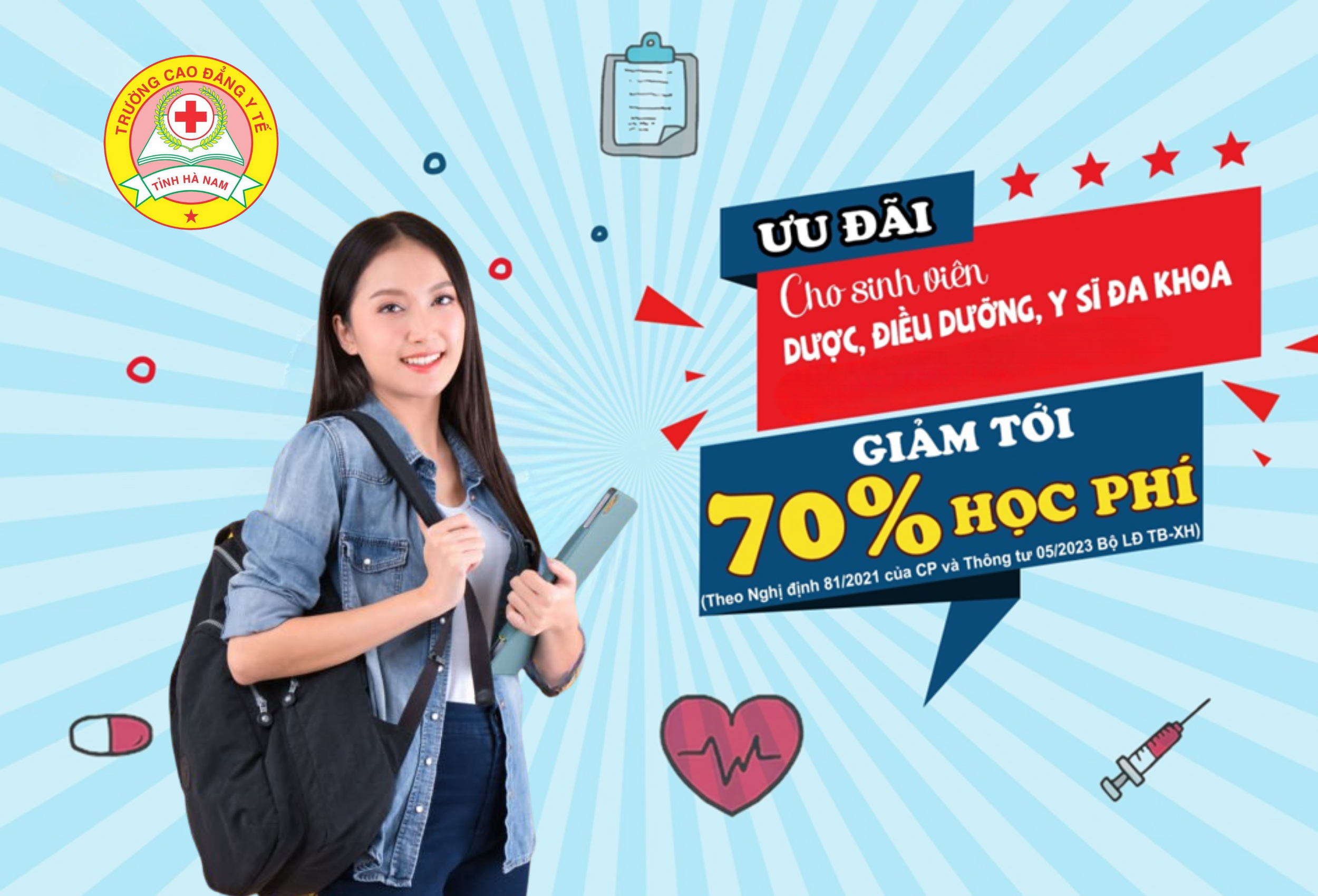 Theo quy định tại Nghị định 81/2021/NĐ-CP, quy định về cơ chế thu, quản lý học phí đối với cơ sở giáo dục thuộc hệ thống giáo dục quốc dân và chính sách miễn giảm học phí, hỗ trợ chi phí học tập; giá dịch vụ trong lĩnh vực giáo dục, đào tạo. Hiện tại hệ chính quy tại trường cao đẳng Y Tế Hà Nam có 3 ngành được hỗ trợ 70% học phí bao gồm: Dược, Điều dưỡng, Y sĩ đa khoa áp dụng dựa trên thông tư 05/2023/TT-BLĐTBXH.